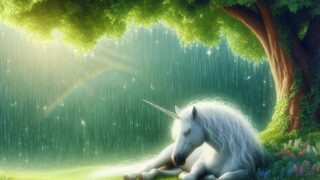 雨上がりの森で光の雫を抱くユニコーン。涙が希望に変わる瞬間を描く物語。