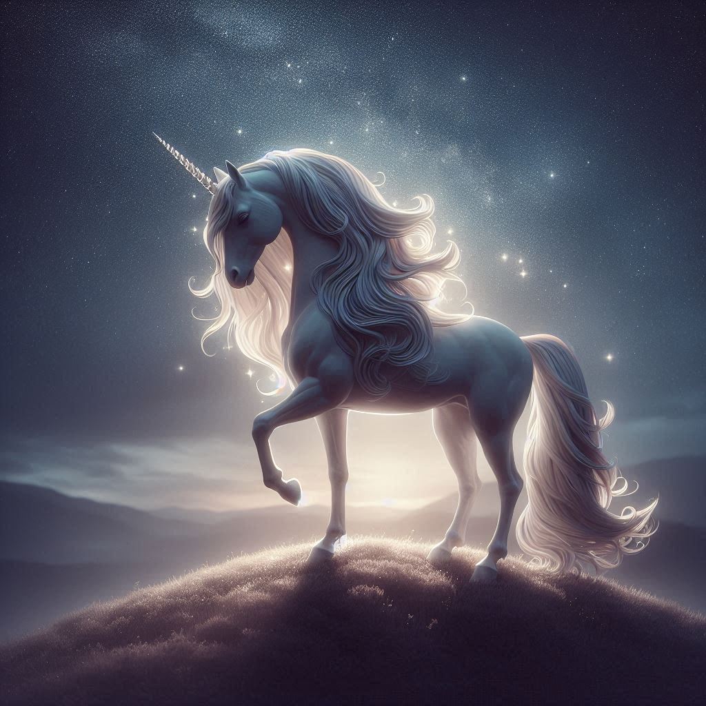 By the lake’s edge stood a unicorn, its horn glowing softly in the moonlight.
