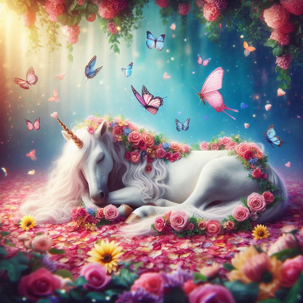 The unicorn laid down, surrounded by the soft chorus of petals.